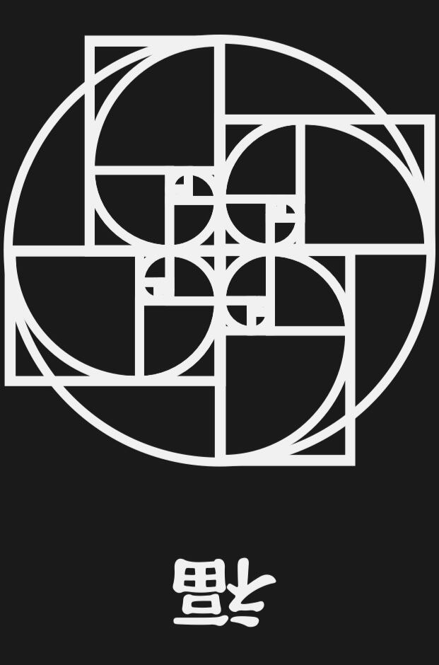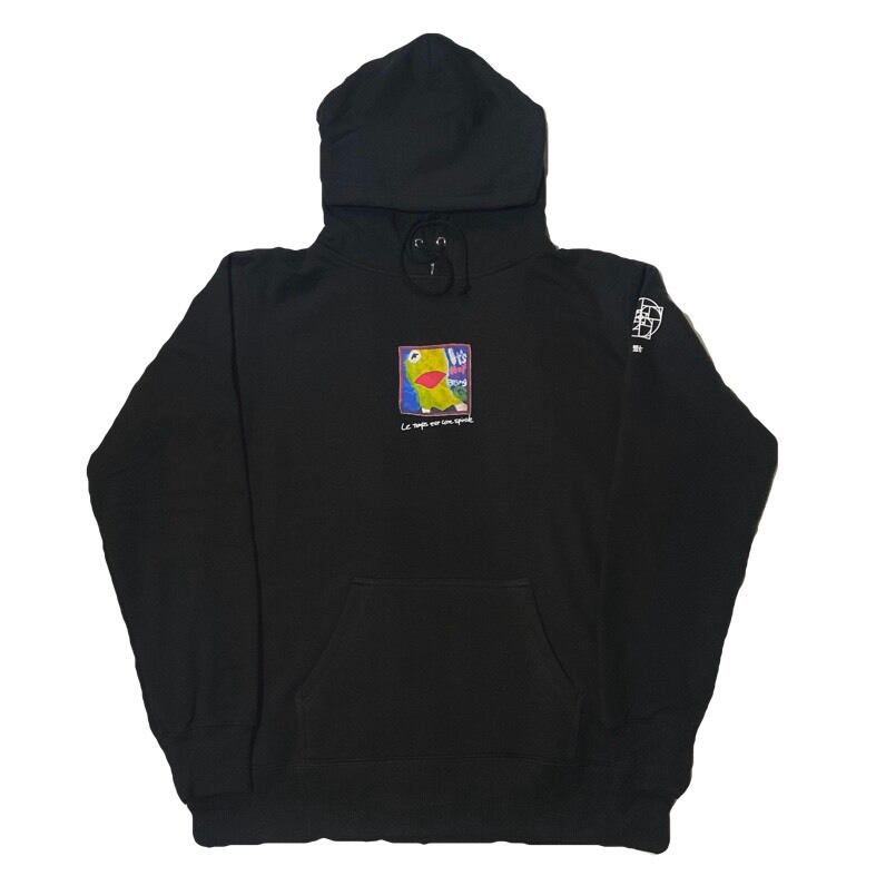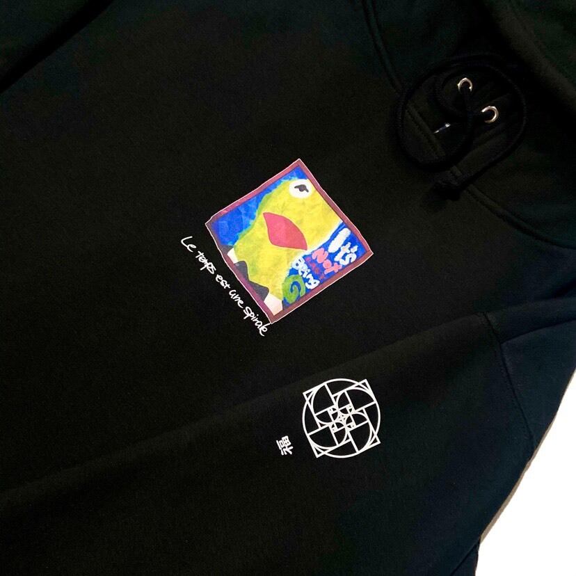 「Le temps est une spirale = 時は螺旋」という言葉としわくちゃになった、ボードに描かれたペインティングをフロント部分にプリント。袖のプリントは、「MICHIO/MESO」のジャケットにも使われた不思議体験をした森(秘密)と黄金比の倒福ロゴの2パターン。